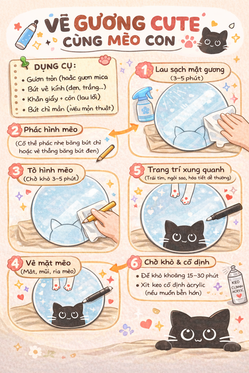 Vẽ đầu mèo hình bán nguyệt ở mép dưới gương
