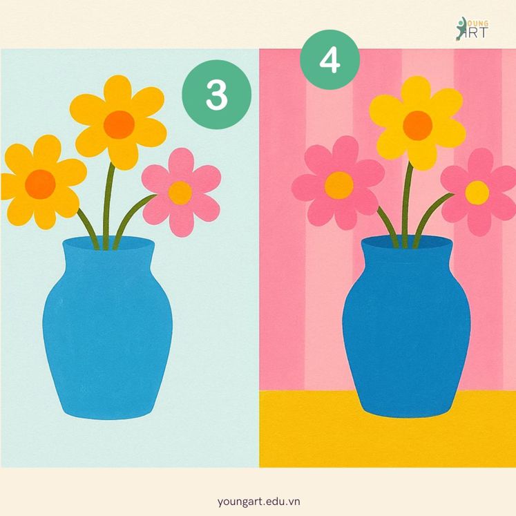 Chia từng bước, vẽ theo nhóm màu (vẽ hết chi tiết màu vàng → hồng → xanh…) để bé dễ làm.