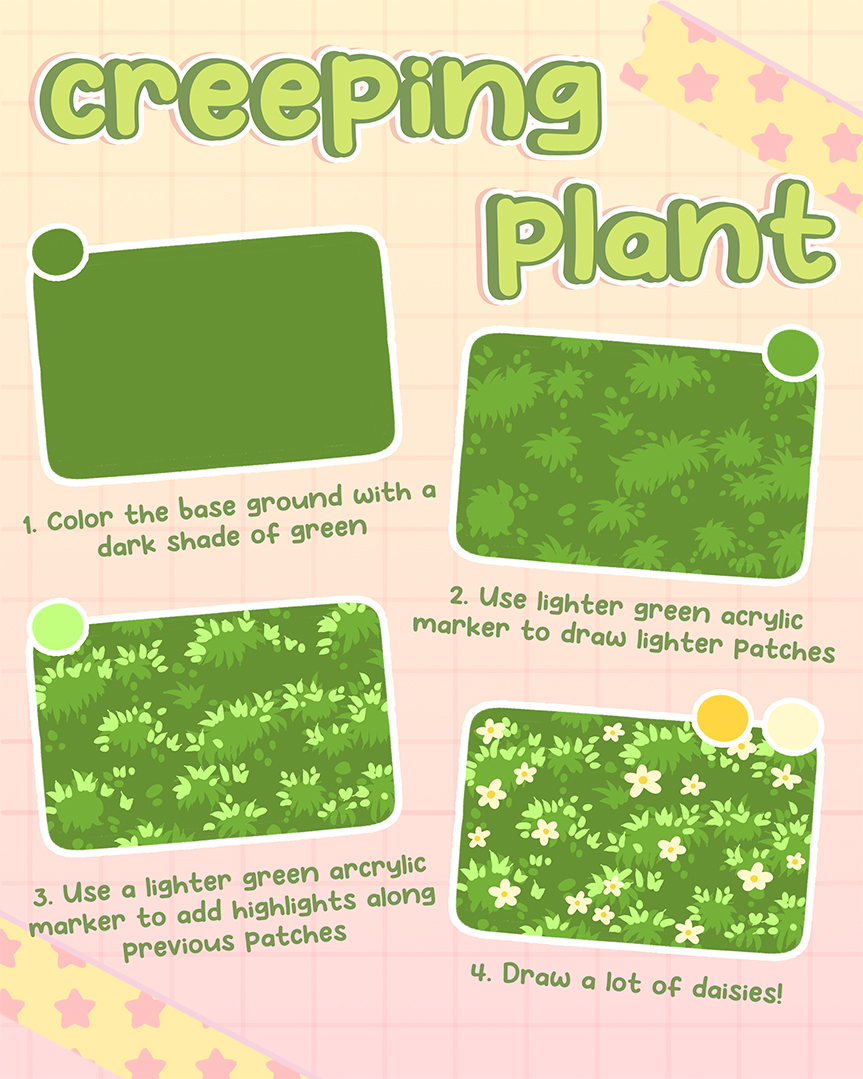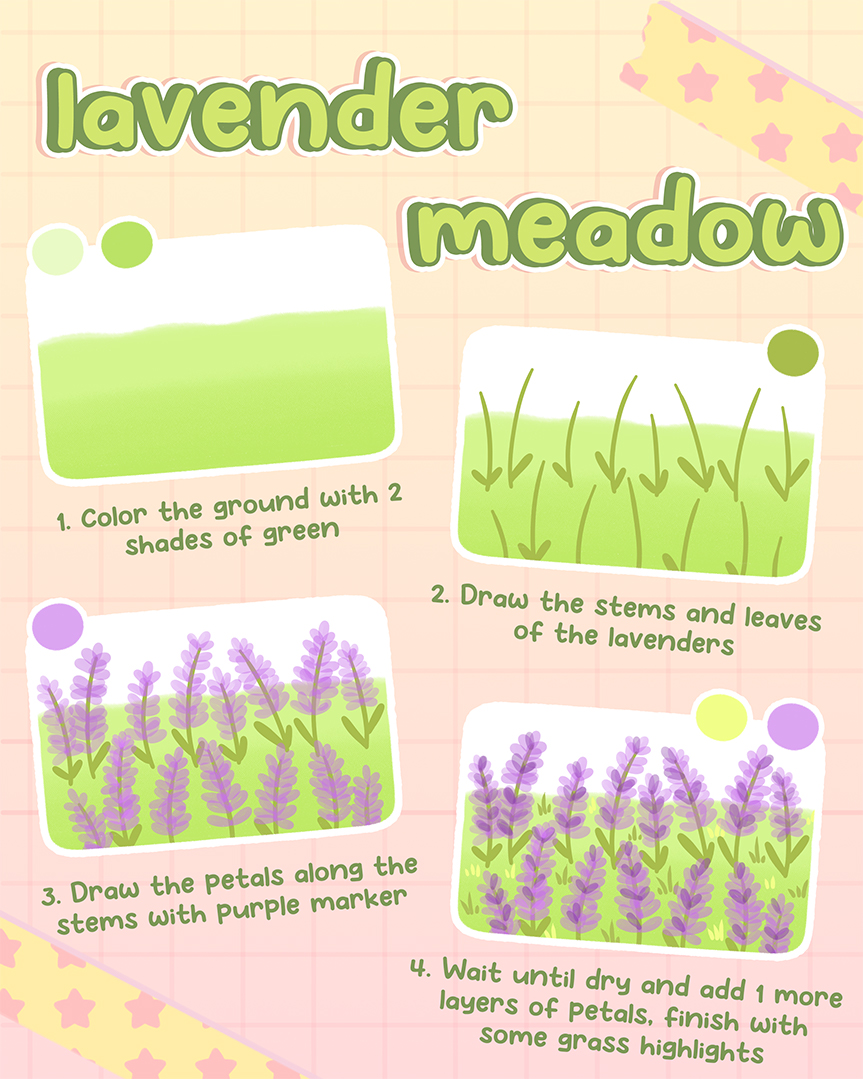 Tiếp tục với xanh nhạt hơn, vẽ cỏ cao hơn và mảnh hơn, đan xen cỏ đậm.
